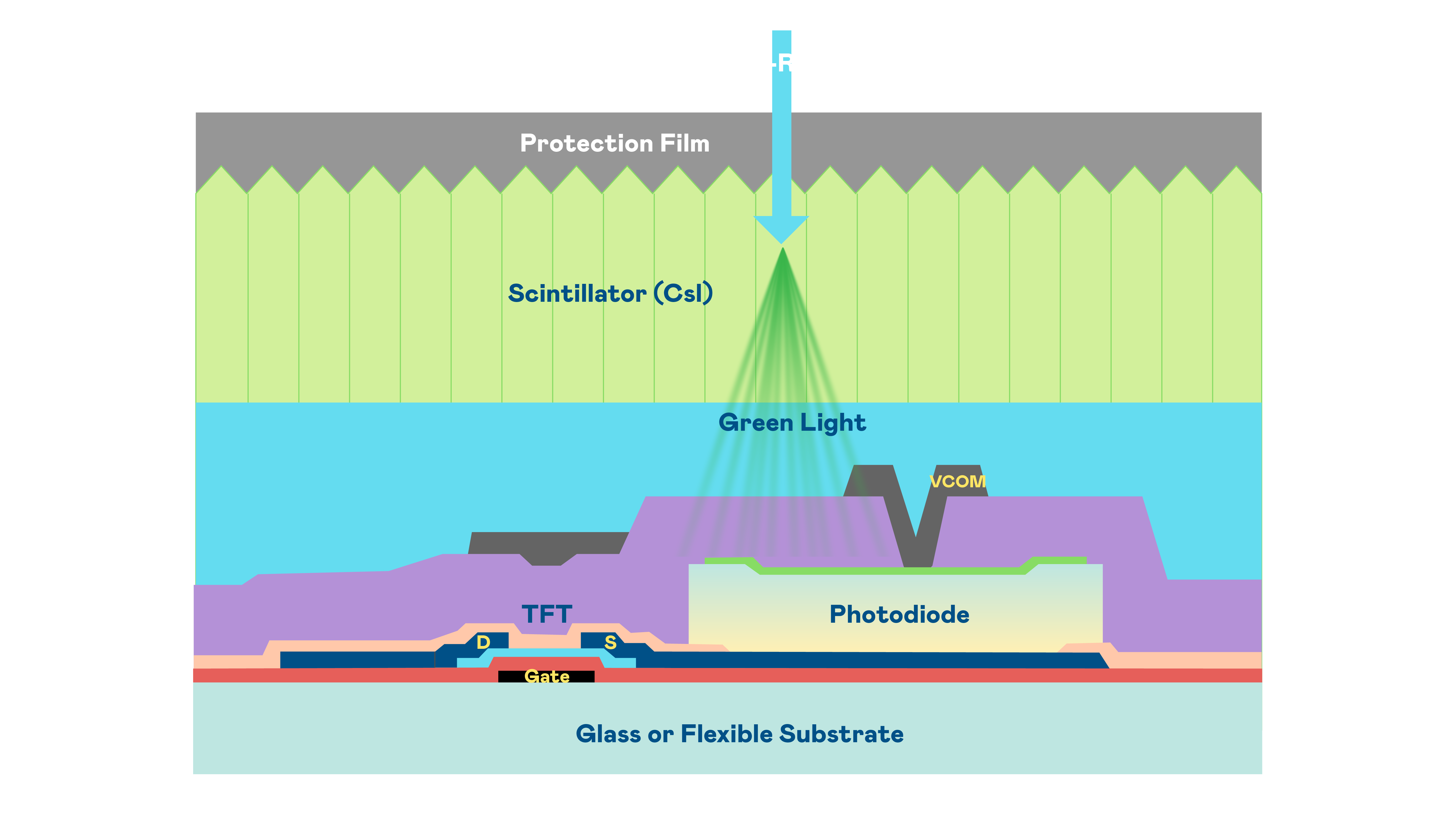 j9九游会登录入口首页j988me的X光影像感测阵列使用薄膜电晶体 (TFT) 作为每个像素的读取开关,搭配光电二极体(Photodiode)的光电转换元件,用以感测X光影像讯号。